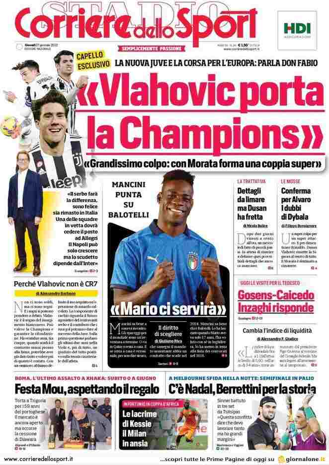 La rassegna stampa di Calciomercato.it vi propone i titoli principali sulla prima pagina di oggi, giovedì 27 gennaio 2022, del ‘Corriere dello Sport’: