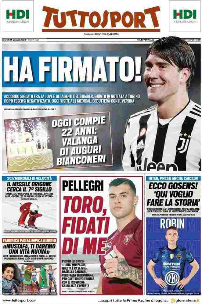 La rassegna stampa di Calciomercato.it vi propone i titoli principali sulla prima pagina di oggi, venerdì 28 gennaio 2022, di ‘TuttoSport’: