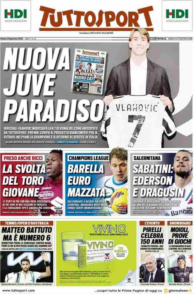 La rassegna stampa di Calciomercato.it vi propone i titoli principali sulla prima pagina di oggi, sabato 29 gennaio 2022, di ‘TuttoSport’: