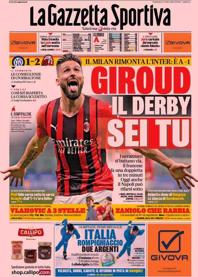 I titoli principali sulla prima pagina del quotidiano sportivo, La Gazzetta dello Sport
