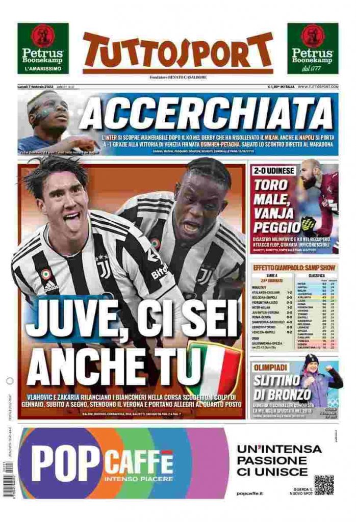 La rassegna stampa di Calciomercato.it vi propone i titoli principali sulla prima pagina di oggi, lunedì 7 febbraio 2022, di ‘TuttoSport’: