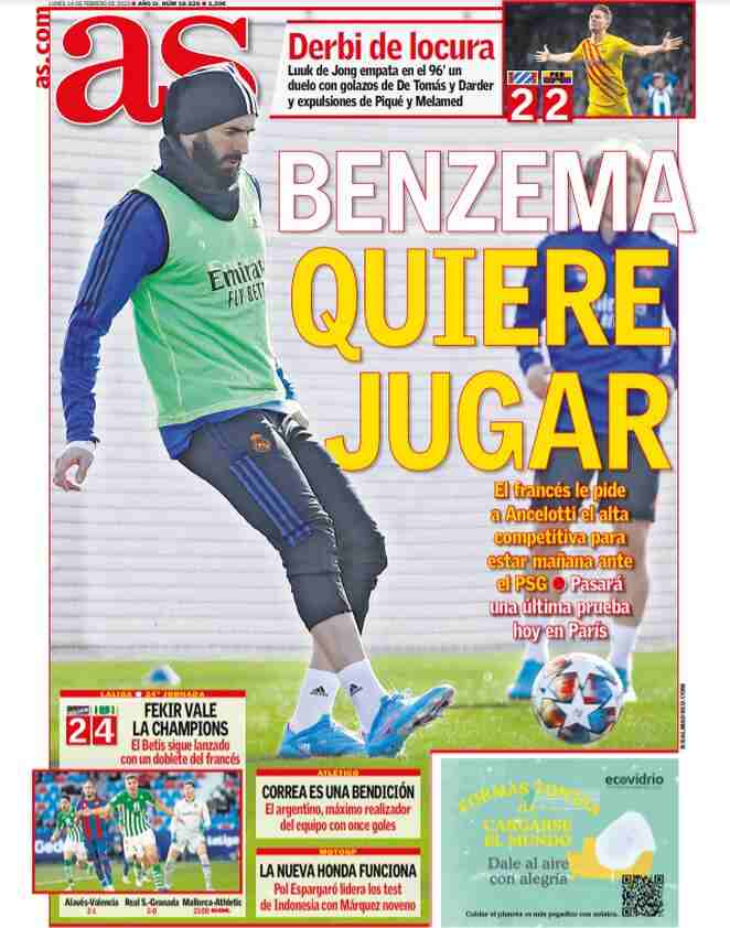 La rassegna stampa di Calciomercato.it vi propone i titoli principali sulla prima pagina di oggi, lunedì 14 febbraio 2022, de ‘AS’: