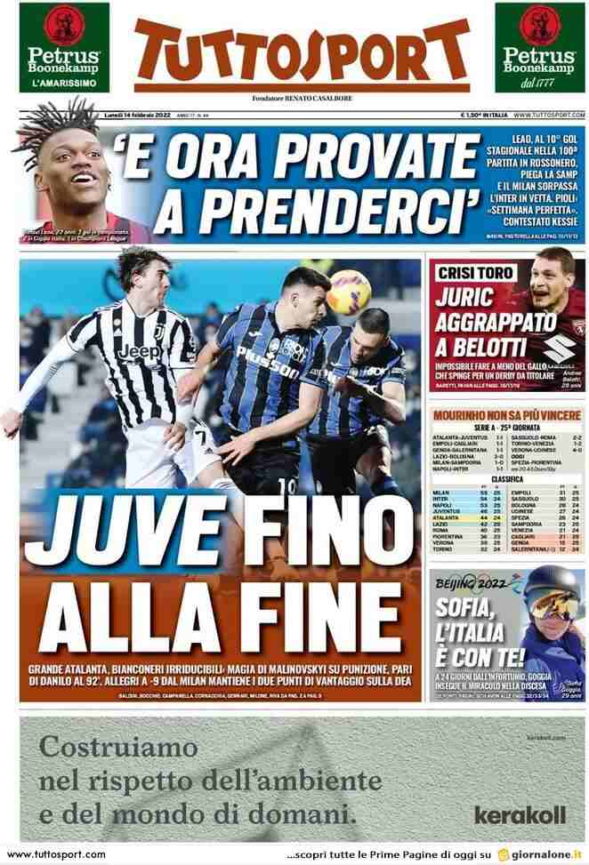 La rassegna stampa di Calciomercato.it vi propone i titoli principali sulla prima pagina di oggi, lunedì 14 febbraio 2022, di ‘TuttoSport’: