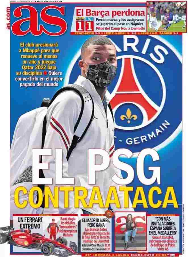 I titoli principali sulla prima pagina del quotidiano sportivo, As