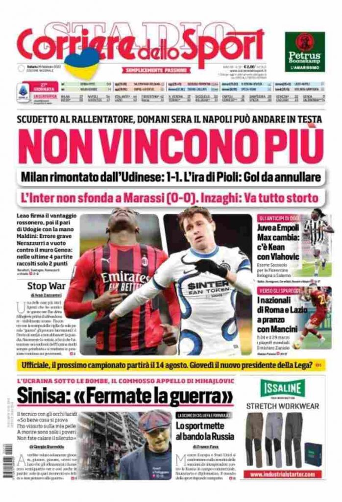 La rassegna stampa di Calciomercato.it vi propone i titoli principali sulla prima pagina di oggi, sabato 26 febbraio 2022, del ‘Corriere dello Sport’: