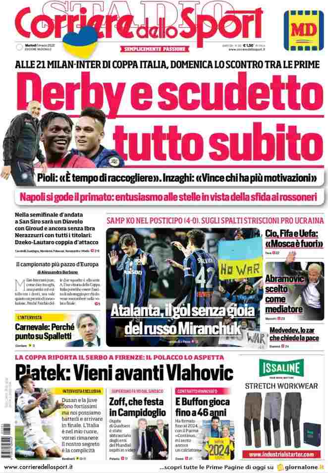 La rassegna stampa di Calciomercato.it vi propone i titoli principali sulla prima pagina di oggi, martedì 1 marzo 2022, del ‘Corriere dello Sport’: