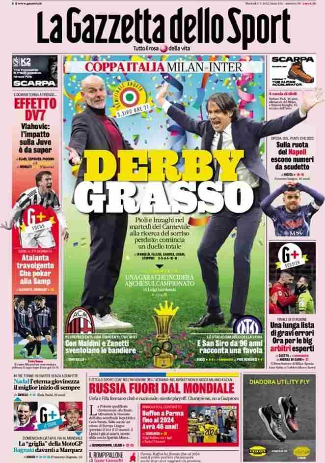I titoli principali sulla prima pagina del quotidiano sportivo, La Gazzetta dello Sport