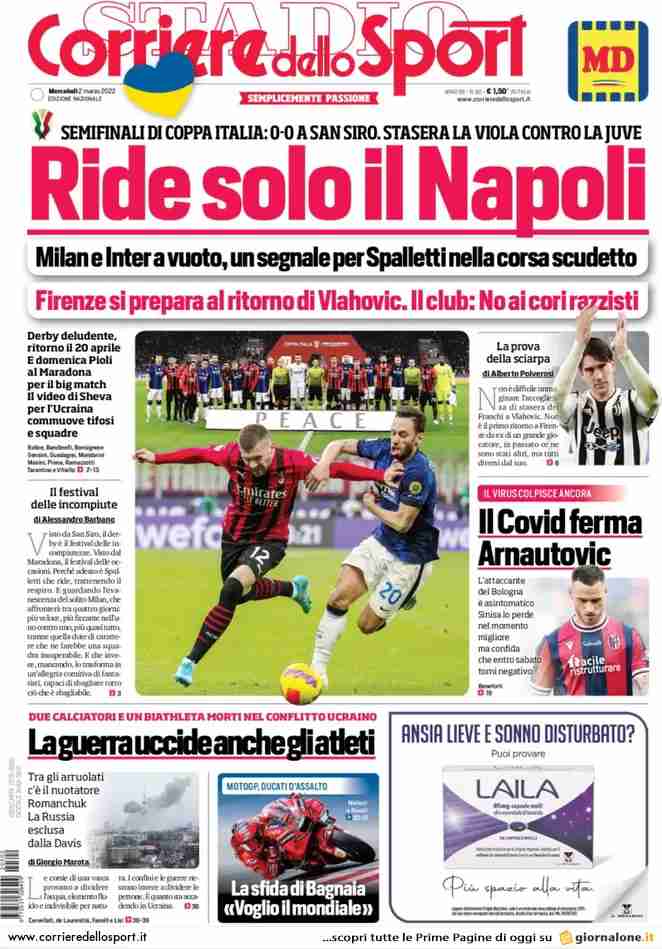 La rassegna stampa di Calciomercato.it vi propone i titoli principali sulla prima pagina di oggi, mercoledì 2 marzo 2022, del ‘Corriere dello Sport’:
