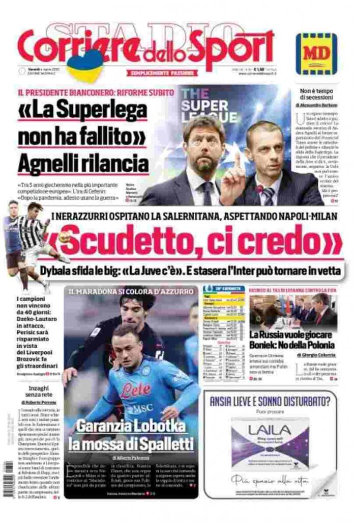 La rassegna stampa di Calciomercato.it vi propone i titoli principali sulla prima pagina di oggi, venerdì 4 marzo 2022, del ‘Corriere dello Sport’: