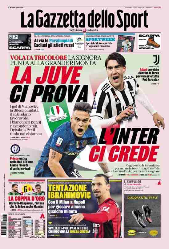 La rassegna stampa di Calciomercato.it vi propone i titoli principali sulla prima pagina di oggi, venerdì 4 marzo 2022, de ‘La Gazzetta dello Sport’: