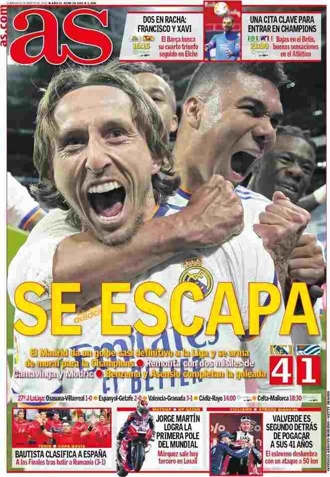 I titoli principali sulla prima pagina del quotidiano sportivo, As