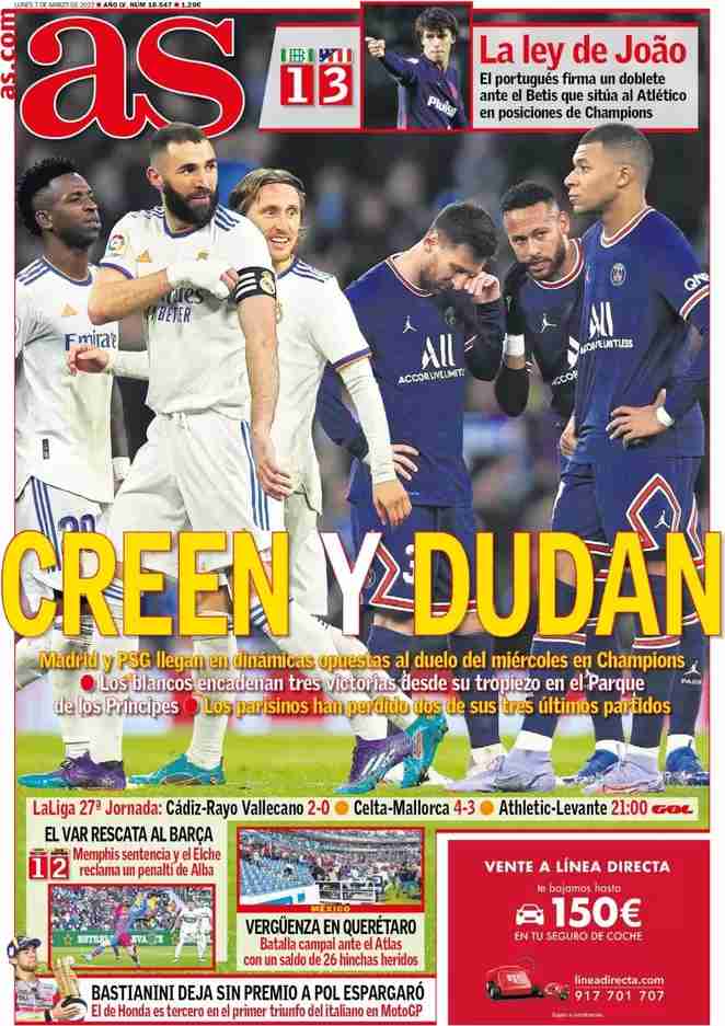 I titoli principali sulla prima pagina del quotidiano sportivo, As