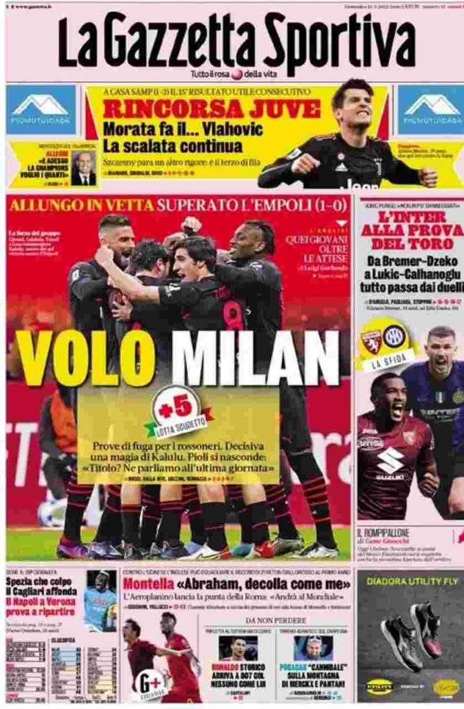 I titoli principali sulla prima pagina del quotidiano sportivo, La Gazzetta dello Sport