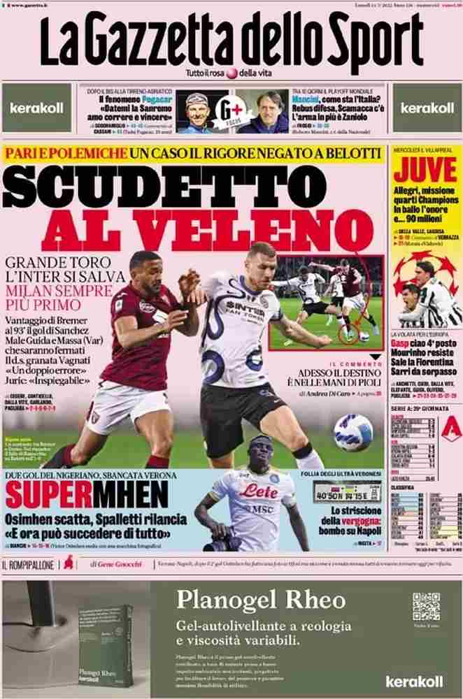 I titoli principali sulla prima pagina del quotidiano sportivo, La Gazzetta dello Sport