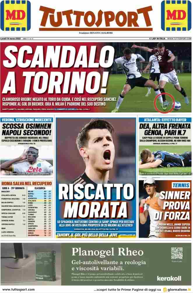 I titoli principali sulla prima pagina del quotidiano sportivo, TuttoSport