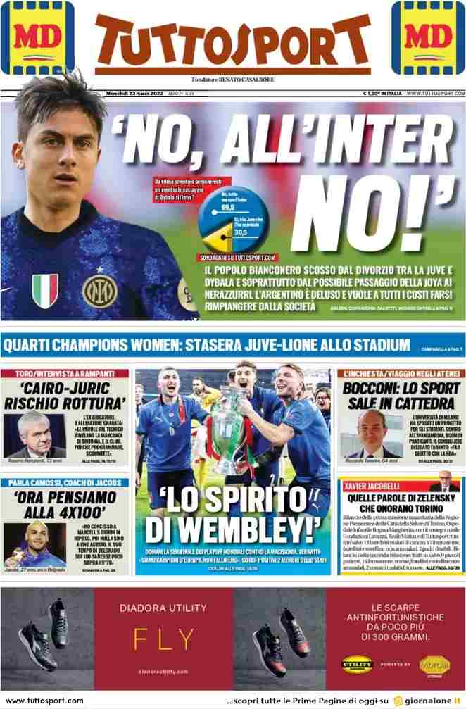 La rassegna stampa di Calciomercato.it vi propone i titoli principali sulla prima pagina di oggi, mercoledì 23 marzo 2022, di ‘TuttoSport’: