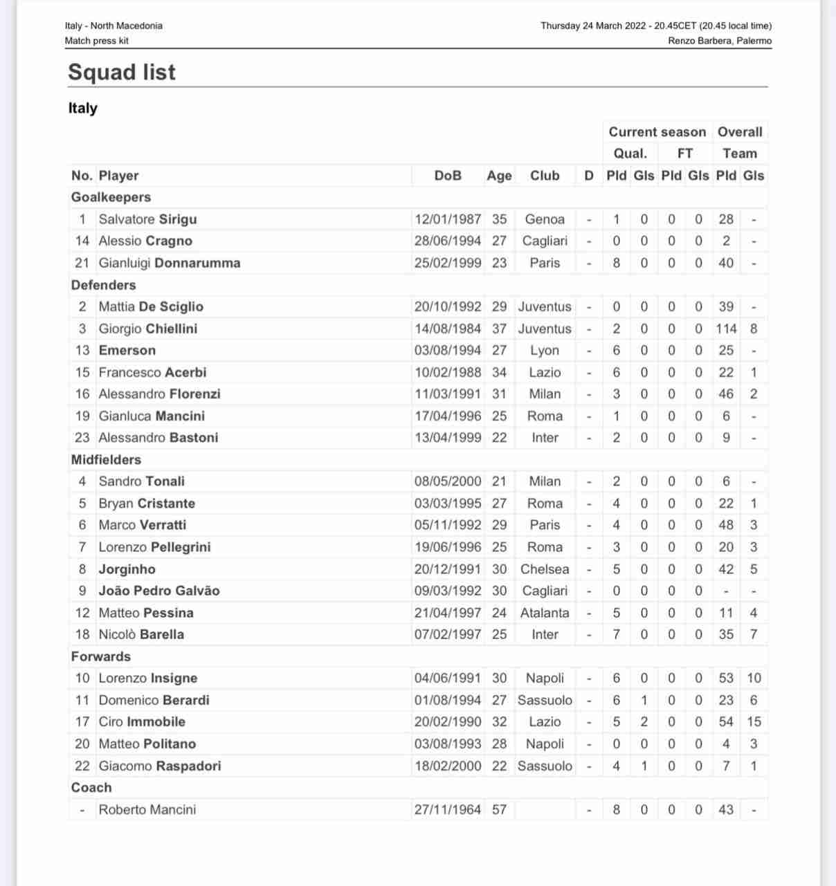 🚨🇮🇹UFFICIALE Lista #Mancini per #ItaliaMacedoniadelnord: esclusi Gollini, Biraghi, #Bonucci, Luiz Felipe, locatelli, #Sensi, #Belotti, #Scamacca, Zaccagni e #Zaniolo