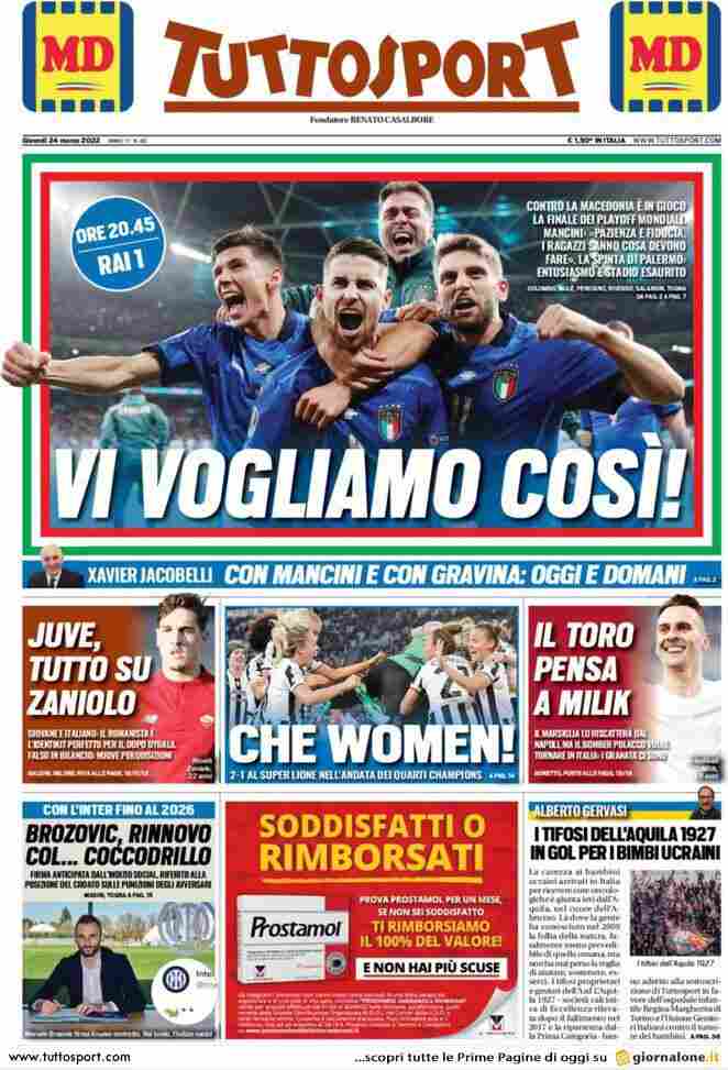 La rassegna stampa di Calciomercato.it vi propone i titoli principali sulla prima pagina di oggi, giovedì 24 marzo 2022, di ‘TuttoSport’: