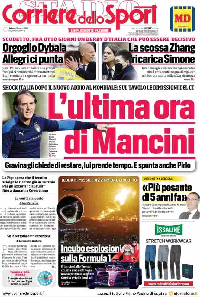 La rassegna stampa di Calciomercato.it vi propone i titoli principali sulla prima pagina di oggi, sabato 26 marzo 2022, del ‘Corriere dello Sport’: