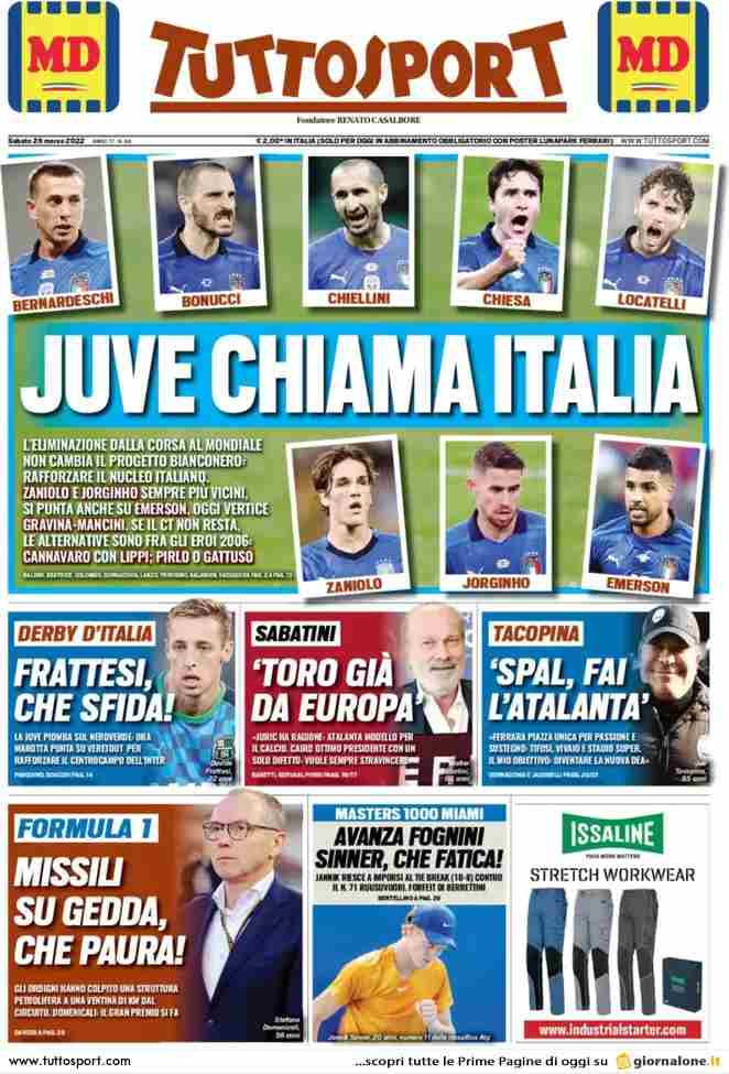 I titoli principali sulla prima pagina del quotidiano sportivo, TuttoSport