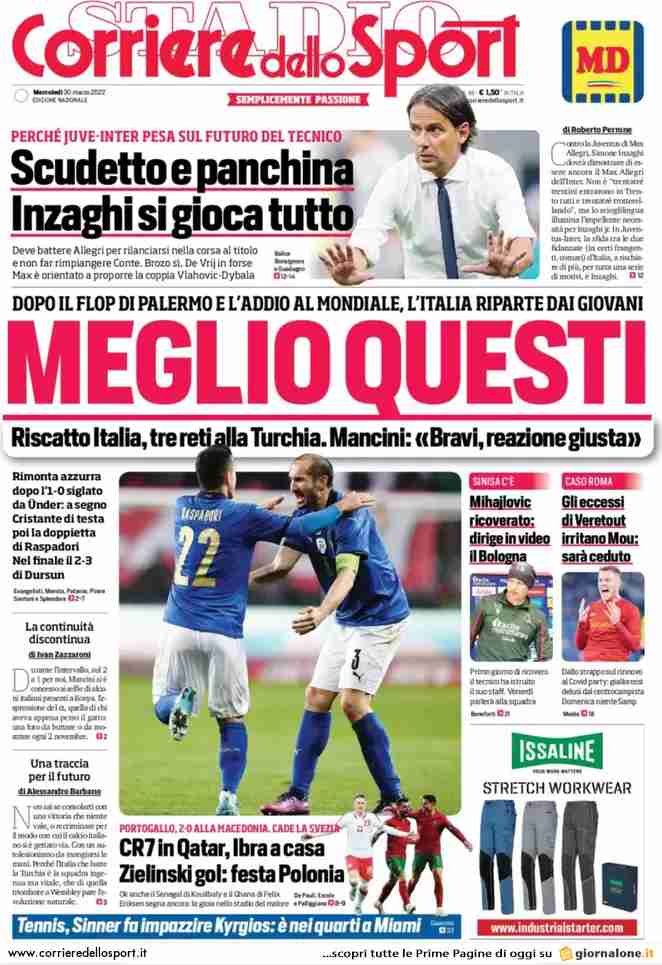 La rassegna stampa di Calciomercato.it vi propone i titoli principali sulla prima pagina di oggi, mercoledì 30 marzo 2022, del ‘Corriere dello Sport’: