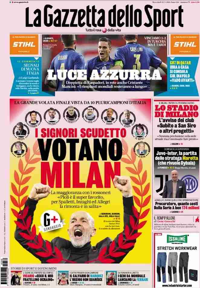 La rassegna stampa di Calciomercato.it vi propone i titoli principali sulla prima pagina di oggi, mercoledì 30 marzo 2022, de ‘La Gazzetta dello Sport’: