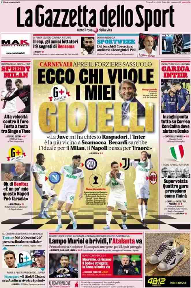 La rassegna stampa di Calciomercato.it vi propone i titoli principali sulla prima pagina di oggi, venerdì 8 aprile 2022, de ‘La Gazzetta dello Sport’: