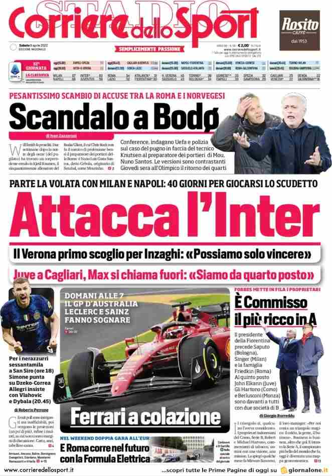 La rassegna stampa di Calciomercato.it vi propone i titoli principali sulla prima pagina di oggi, sabato 9 aprile 2022, del ‘Corriere dello Sport’: