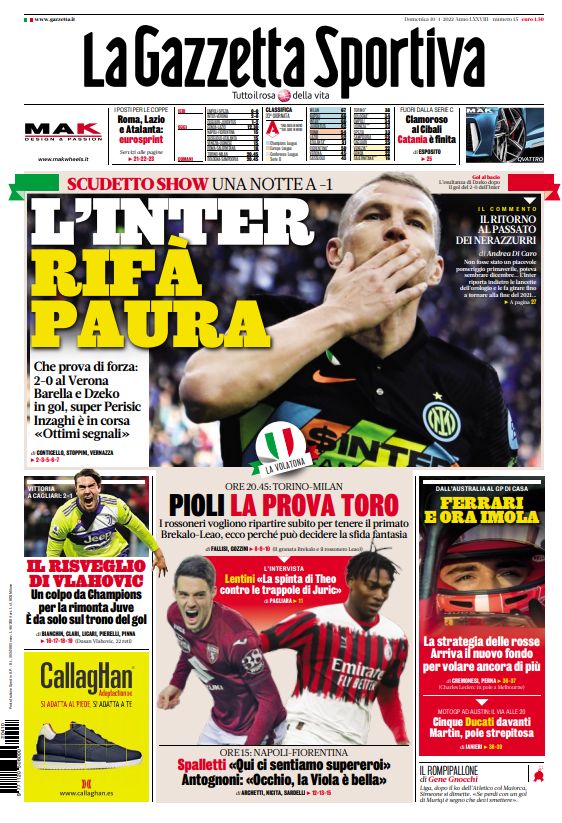 La rassegna stampa di Calciomercato.it vi propone i titoli principali sulla prima pagina di oggi, domenica 10 aprile 2022, de ‘La Gazzetta dello Sport’: