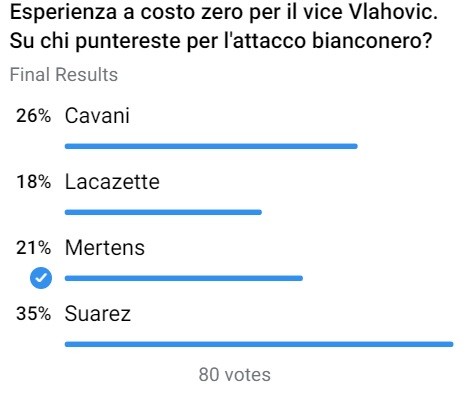 Quest’oggi, infatti, nel consueto sondaggio proposto ai nostri utenti sul nostro profilo Telegram, abbiamo chiesto quale tra gli attaccanti con grande qualità ed esperienza in questione facesse maggiormente al caso della Juve. I profili in lizza erano Edinson Cavani, Alexandre Lacazette, Dries Mertens e proprio Luis Suarez. Quest’ultimo ha vinto con il 35% delle preferenze, davanti a Cavani fermo a 26%.