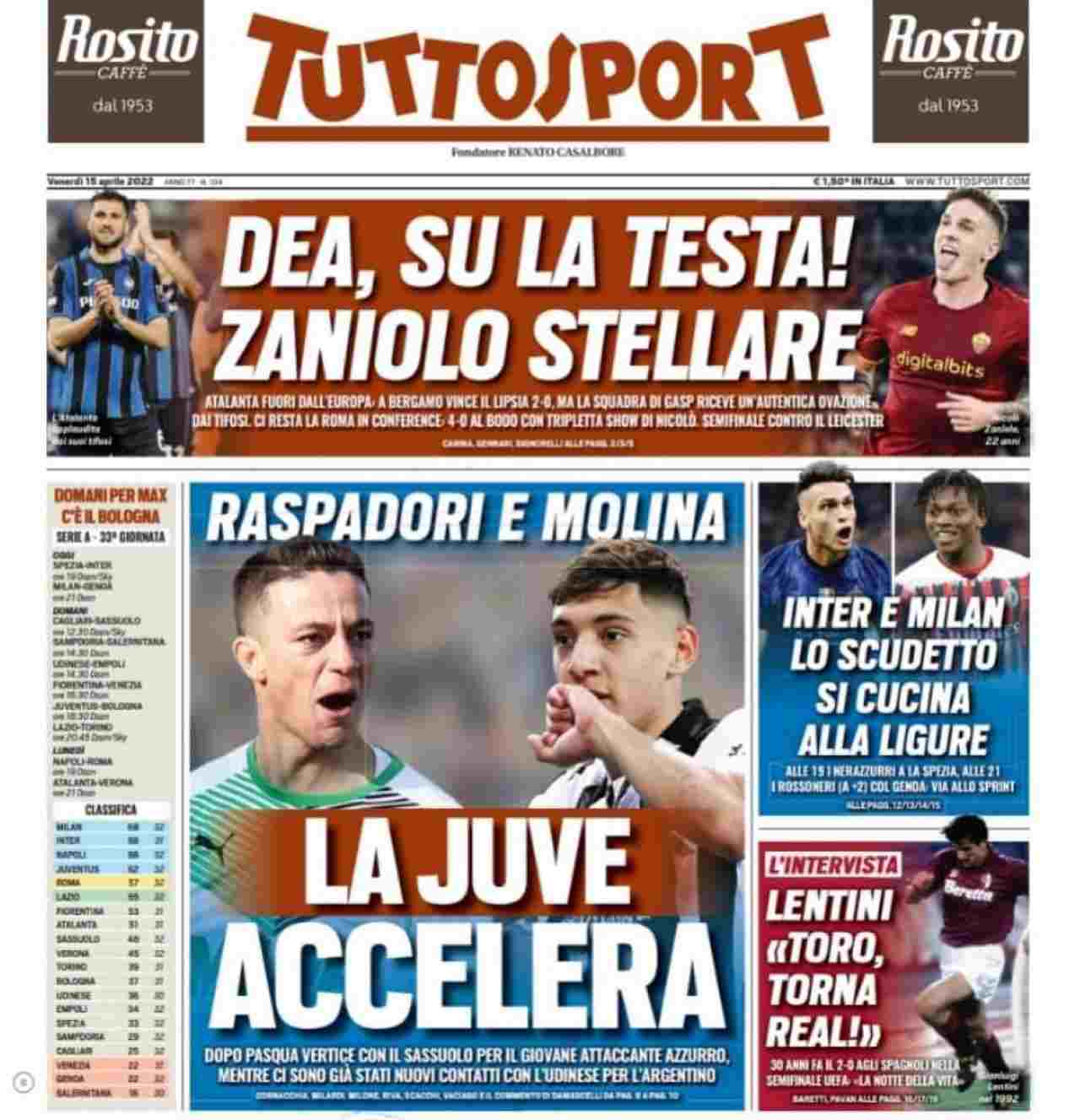 La rassegna stampa di Calciomercato.it vi propone i titoli principali sulla prima pagina di oggi, venerdì 15 aprile 2022, di Tuttosport: