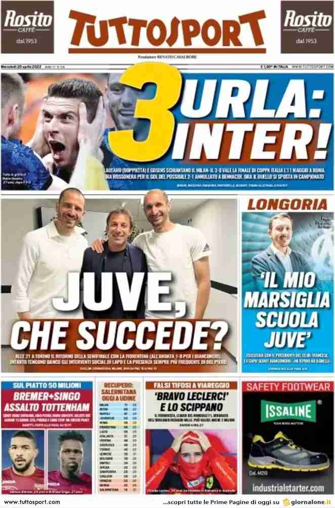 La rassegna stampa di Calciomercato.it vi propone i titoli principali sulla prima pagina di oggi, mercoledì 20 aprile 2022, di ‘Tuttosport’: