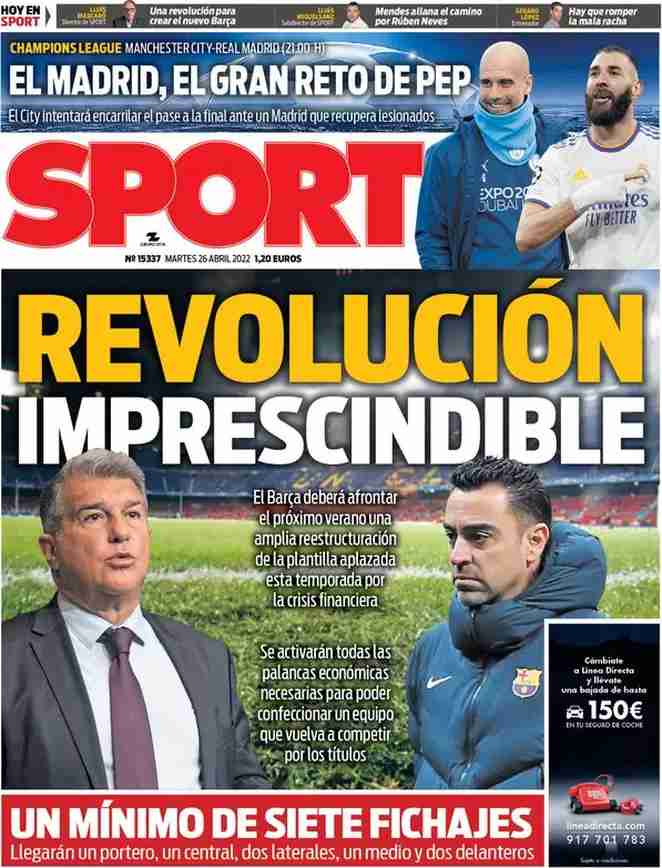 I titoli principali sulla prima pagina di oggi del quotidiano sportivo spagnolo, ‘Sport’