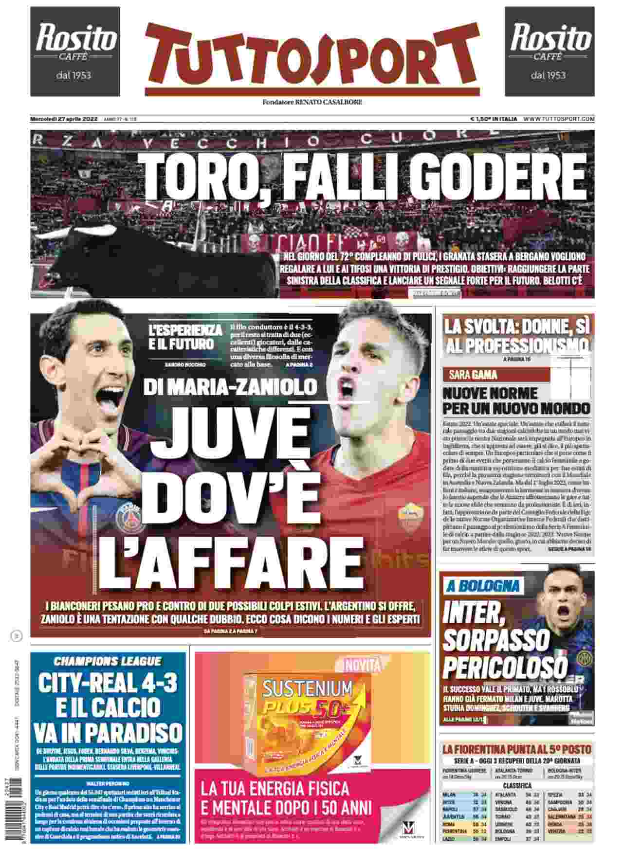 La rassegna stampa di Calciomercato.it vi propone i titoli principali sulla prima pagina di oggi, mercoledì 27 aprile 2022, di ‘Tuttosport’.