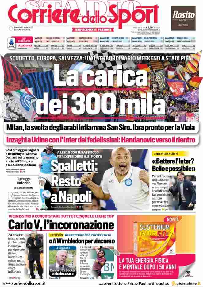 La rassegna stampa di Calciomercato.it vi propone i titoli principali sulla prima pagina di oggi, sabato 30 aprile 2022, del ‘Corriere dello Sport’.