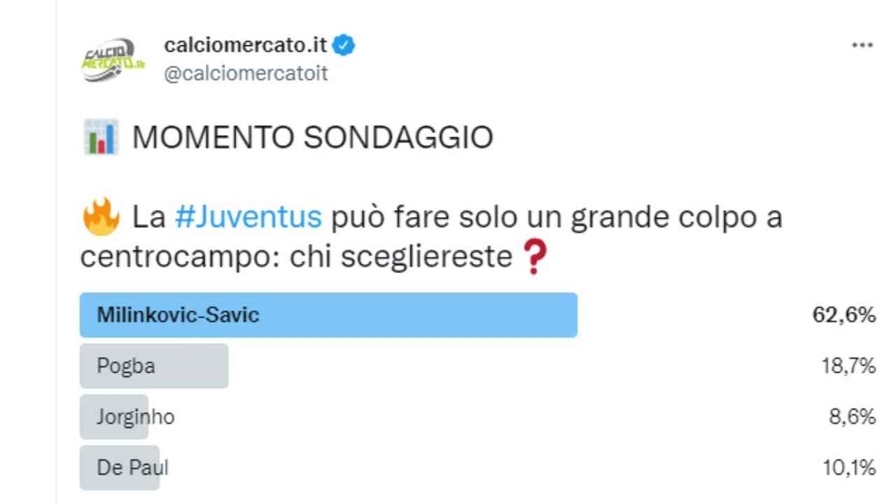 Il 18,7% ha invece votato per il ritorno di Paul Pogba. Anche il centrocampista francese potrebbe cambiare aria in estate e tanti bianconeri sognano di rivederlo a Torino. Per il 10,1% il nome giusto è quello invece di Rodrigo De Paul. L’argentino non sta forse rendendo quanto ci si aspettasse con la maglia dell’Atletico Madrid: chissà che non possa magari tornare in Italia in estate. Possibile ritorno in Italia anche per Jorginho. L’agente, in esclusiva a Calciomercato.it, aveva rivelato come, senza offerte per una nuova proprietà, il centrocampista sarebbe rimasto al Chelsea al 100%. Solo l’8,6% dei votanti ha però scelto l’ex centrocampista del Napoli.