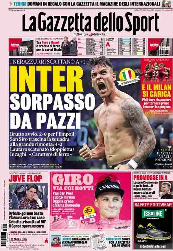 La rassegna stampa di Calciomercato.it vi propone i titoli principali sulla prima pagina di oggi, sabato 7 maggio 2022, de ‘La Gazzetta dello Sport’: