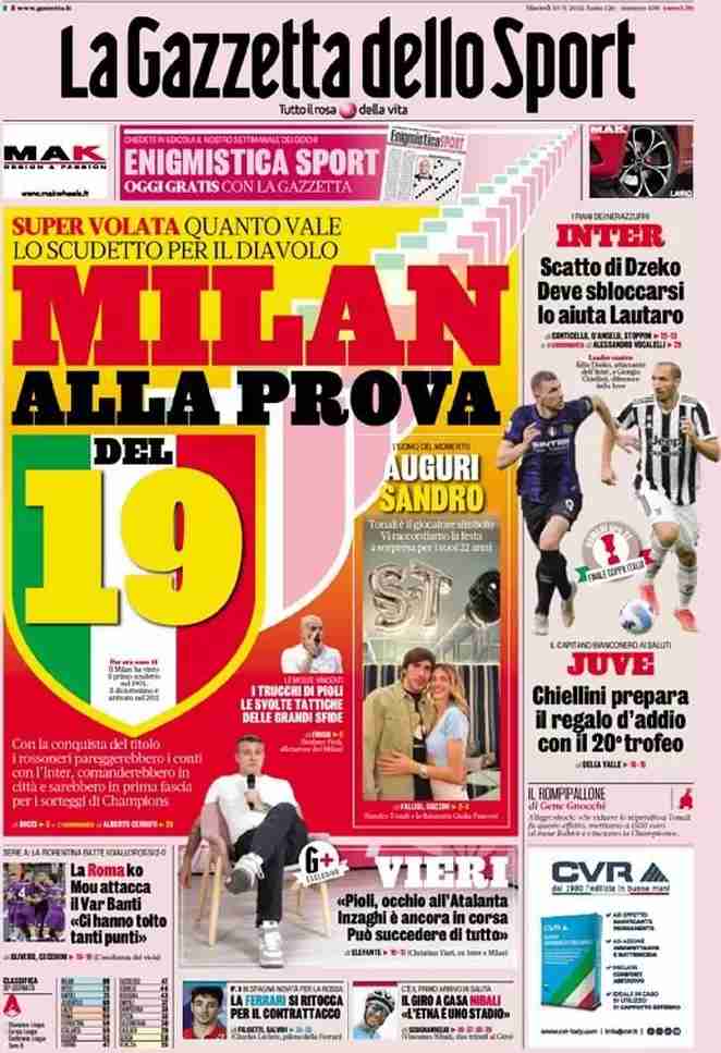 La rassegna stampa di Calciomercato.it vi propone i titoli principali sulla prima pagina di oggi, martedì 10 maggio 2022, de ‘La Gazzetta dello Sport’: