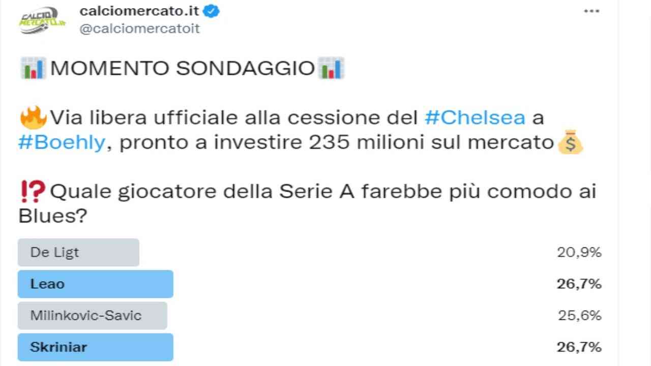 A riguardo abbiamo chiesto al pubblico di Twitter di Calciomercato.it quale giocatore della Serie A farebbe più comodo alla società inglese. Il risultato è all’insegna dell’equilibrio, perché i follower hanno faticato e non poco a scegliere il nome. L’esito, alla fine, porta ad un pareggio: con il 26,7% sono stati scelti sia Milan Skriniar, difensore dell’Inter, sia l’attaccante portoghese del Milan, Rafael Leao, scelto tra l’altro come miglior giocatore del campionato di Serie A appena concluso e vinto proprio dai rossoneri.