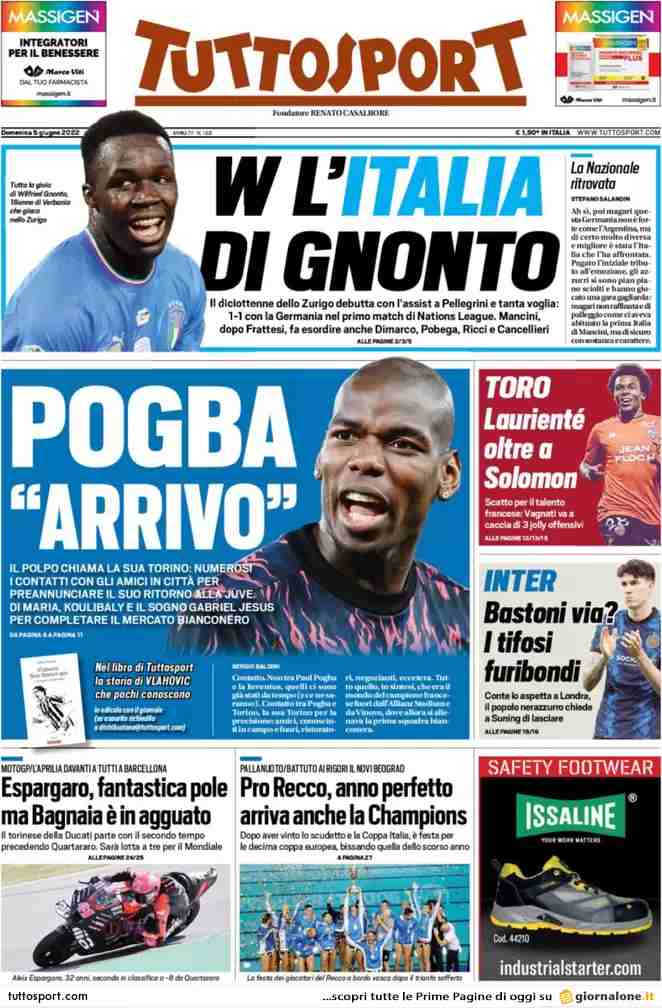 La rassegna stampa di Calciomercato.it vi propone i titoli principali sulla prima pagina di oggi, domenica 5 giugno 2022, di ‘Tuttosport’.