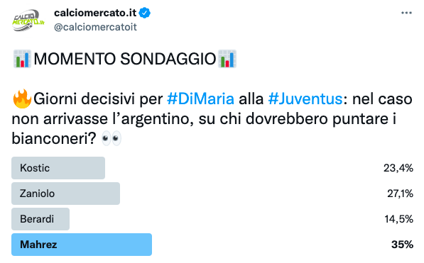 A trionfare nel sondaggio Twitter è stato un titolarissimo del Manchester City di Pep Guardiola, Riyad Mahrez. L’esterno algerino ha superato gli altri candidati conquistando il 35% dei voti, davanti a Zaniolo al 27,1%. Sul gradino più basso del podio si è accomodato Filip Kostic con il 23,4%, anche lui obiettivo molto forte dei bianconeri. Non scalda i tifosi della Juventus, infine, Berardi, ultimo con il 14,5%.
