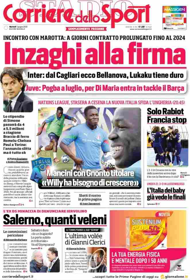 La rassegna stampa di Calciomercato.it vi propone i titoli principali sulla prima pagina di oggi, martedì 7 giugno 2022, del ‘Corriere dello Sport’.