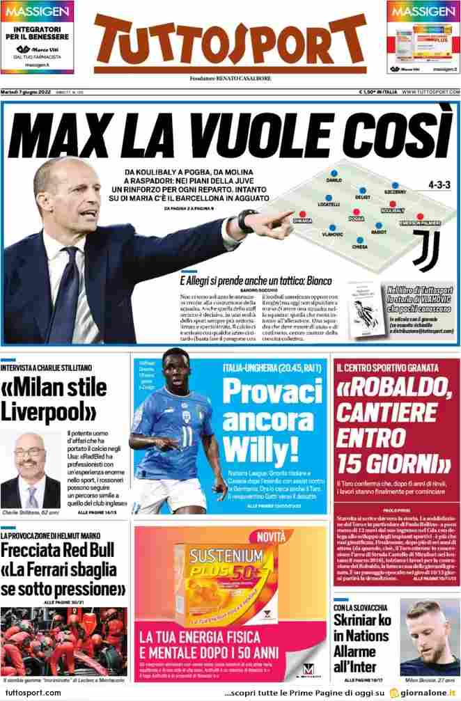 La rassegna stampa di Calciomercato.it vi propone i titoli principali sulla prima pagina di oggi, martedì 7 giugno 2022, di ‘Tuttosport’.