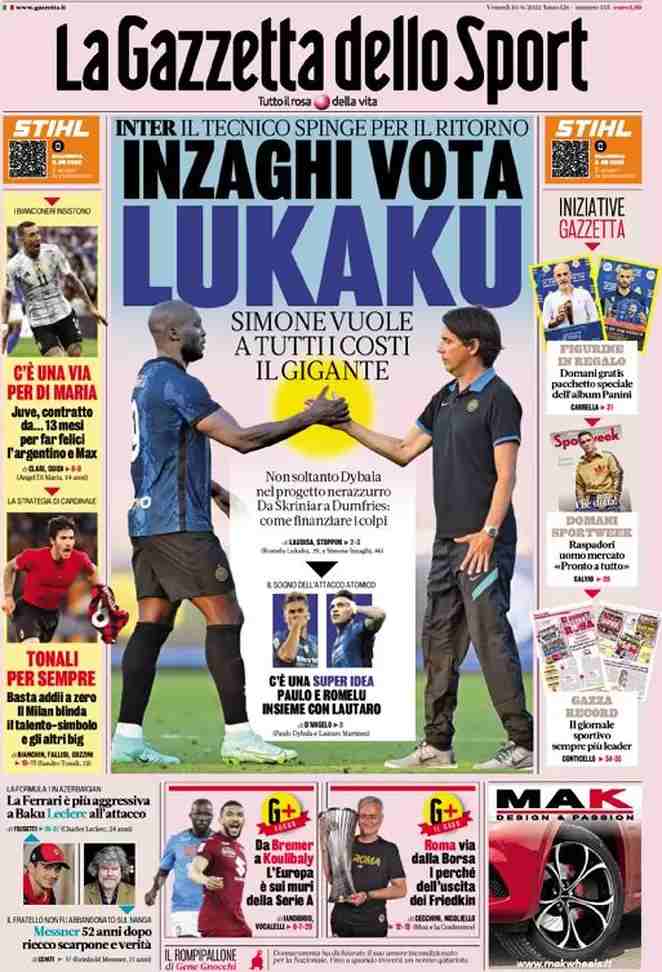 La rassegna stampa di Calciomercato.it vi propone i titoli principali sulla prima pagina di oggi, venerdì 10 giugno 2022, de ‘La Gazzetta dello Sport’.