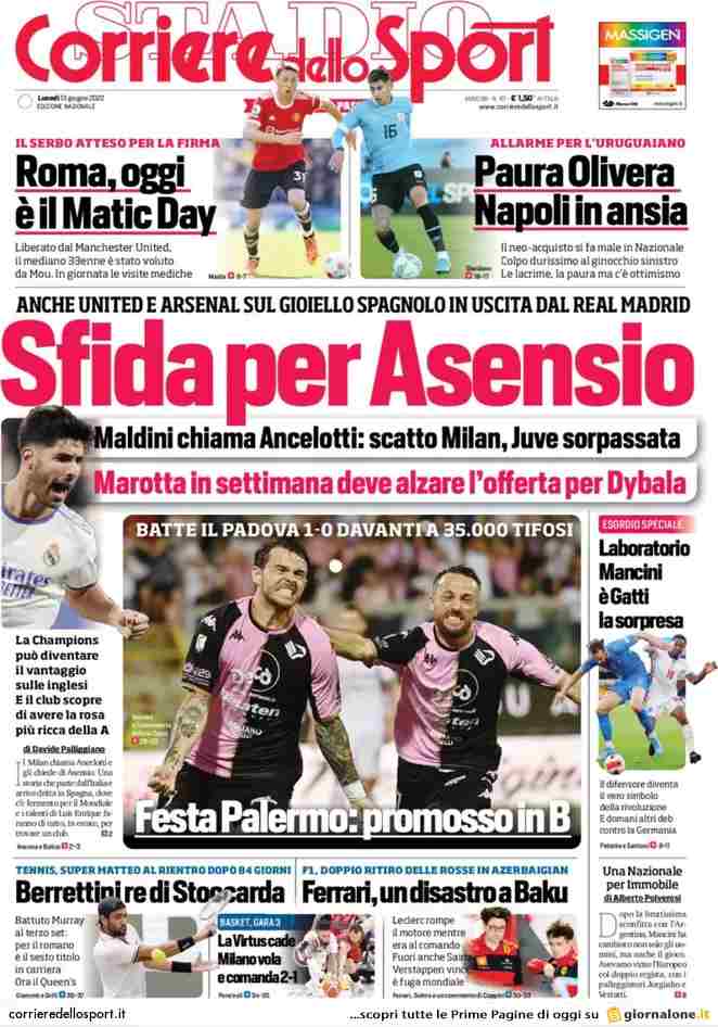 La rassegna stampa di Calciomercato.it vi propone i titoli principali sulla prima pagina di oggi, lunedì 13 giugno 2022, del ‘Corriere dello Sport’.