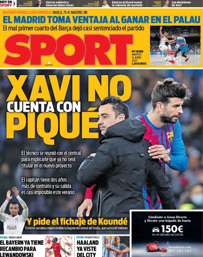 I titoli principali sulla prima pagina del quotidiano sportivo spagnolo, Sport