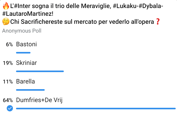 Su Telegram a trionfare è stata la coppia composta da Dumfries e De Vrij, nettamente la più votata come si evince dall’immagine in basso. Su Twitter, invece, è stato indicato il solo Dumfries con il 63,9%, staccato rispetto a Skriniar (21,1%), Bastoni (8,4%) e Barella (6,6%). Anche se, come risaputo, difficilmente all’Inter basterà la sola cessione dell’olandese per finanziare i colpi Dybala e Lukaku.