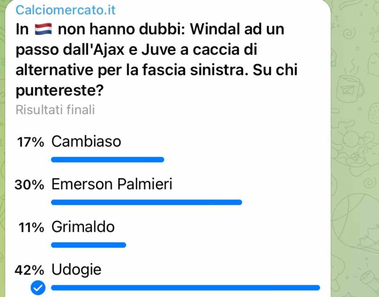 Sul profilo Telegram di Calciomercato.it vi abbiamo voluto sottoporre ad un sondaggio, chiedendovi su quale profilo alternativo puntereste. Le opzioni erano le seguenti: Cambiaso, Emerson Palmieri, Grimaldo e Udogie. A vincere ampiamente il ballottaggio è stato l’esterno di proprietà dell’Udinese, col 42% dei voti. Al secondo posto, invece, si è piazzato il laterale azzurro ex Roma ora al Lione, votato dal 30% degli utenti. Segue, poi, il calciatore del Genoa al terzo posto (17%). Ultimo, infine, Grimaldo del Benfica (11%). Dunque, i tifosi non hanno dubbi: la Juventus deve puntare su Udogie, che piace non poco anche all’Inter.