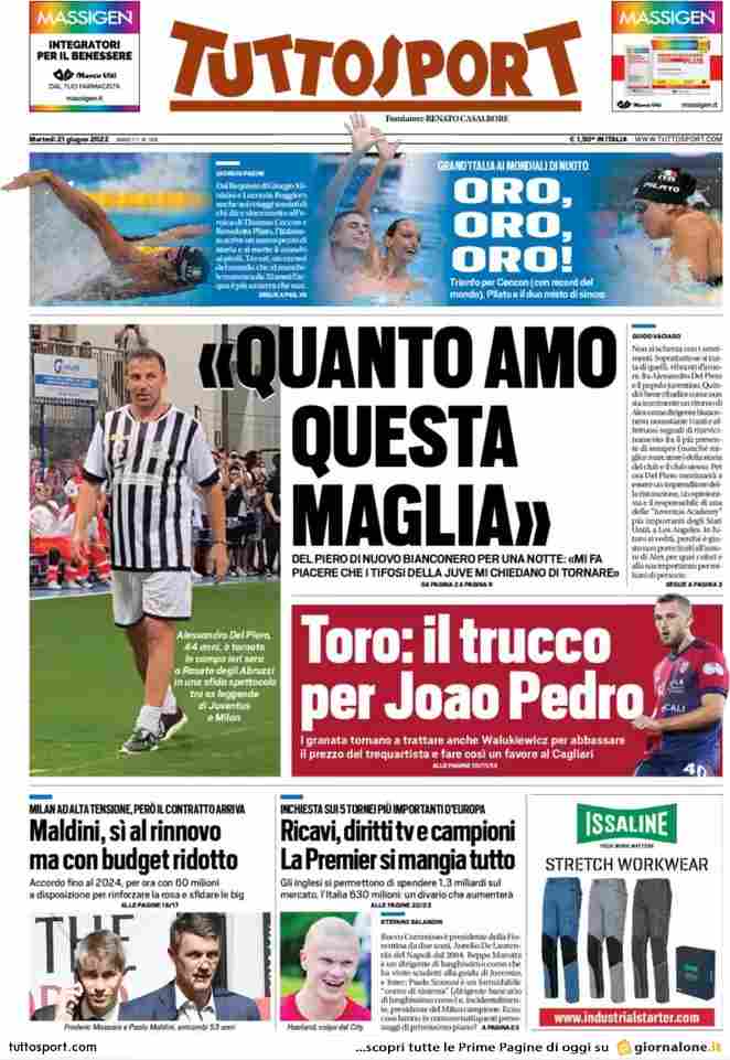 La rassegna stampa di Calciomercato.it vi propone i titoli principali sulla prima pagina di oggi, martedì 21 giugno 2022, di ‘Tuttosport’.