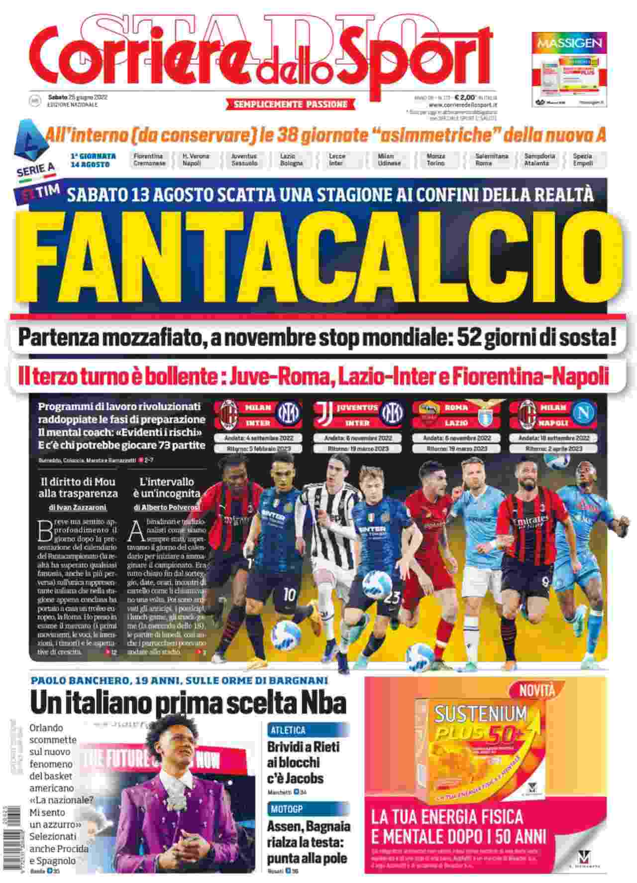 La rassegna stampa di Calciomercato.it vi propone i titoli principali sulla prima pagina di oggi, sabato 25 giugno 2022, del ‘Corriere dello Sport’.
